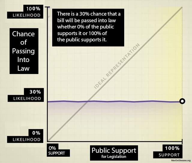 Empirical evidence confirms this pattern. Gilens and Page143 analyzed 1,779 policy decisions over two decades. Finding: “economic elites and organized groups representing business interests have substantial independent impacts on U.S. government policy, while mass-based interest groups and average citizens have little or no independent influence.” The correlation between average citizen preferences and policy outcomes was effectively zero. Whether 0% or 100% of citizens supported a policy, its probability of adoption remained unchanged at approximately 30%. By contrast, policies favored by economic elites were adopted at significantly higher rates. Figure 61.1 illustrates this disconnect.