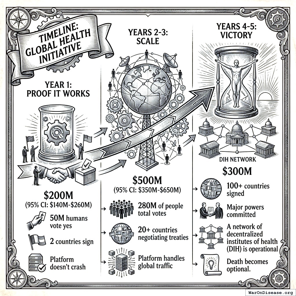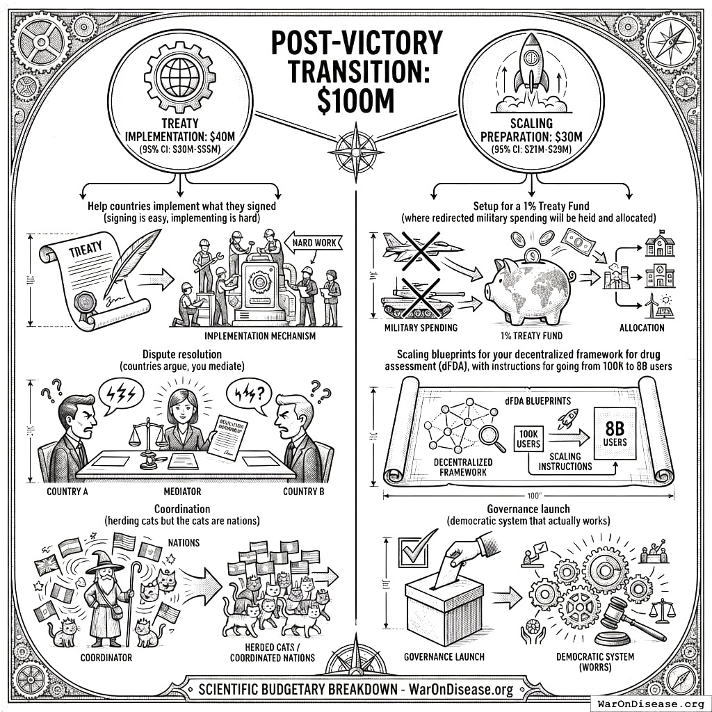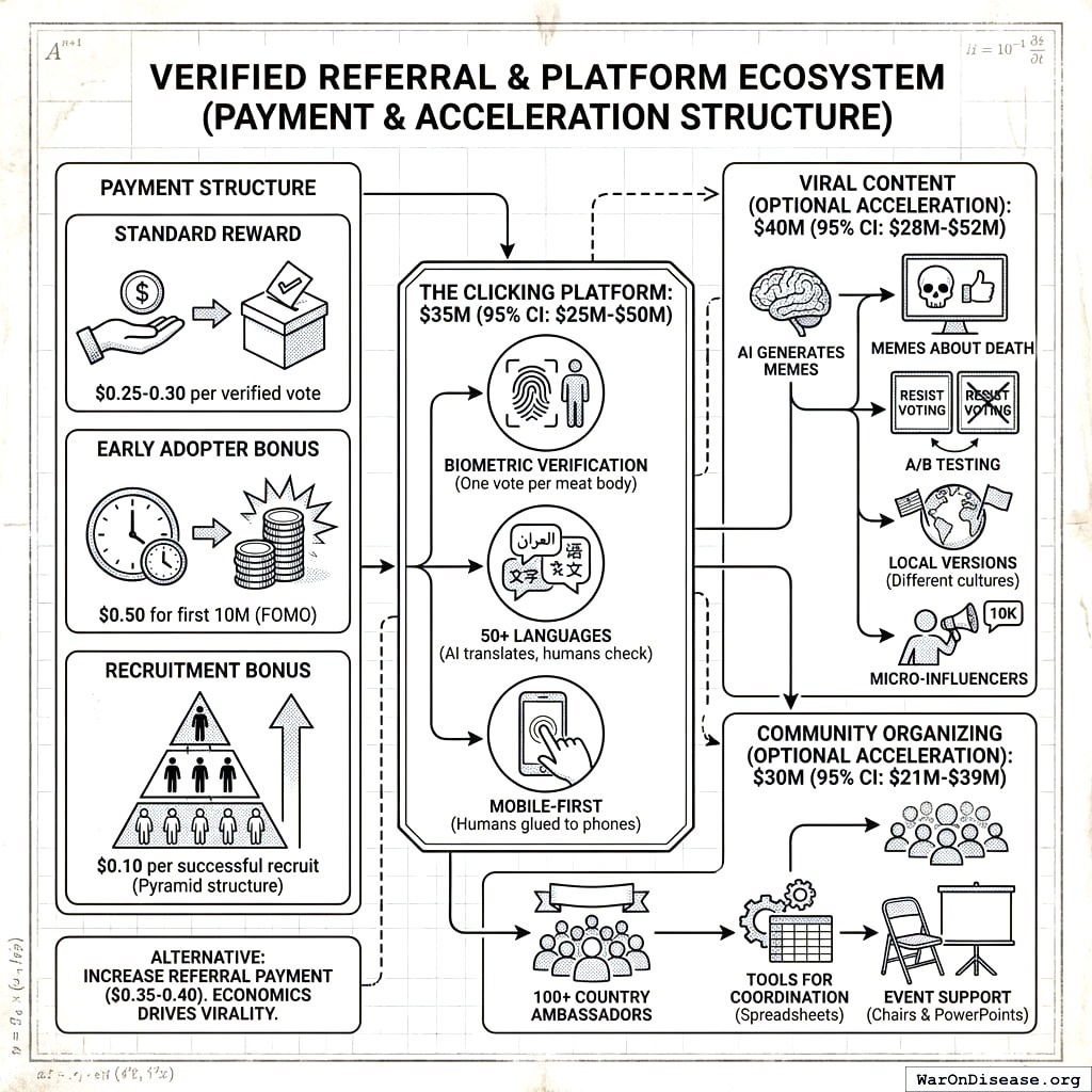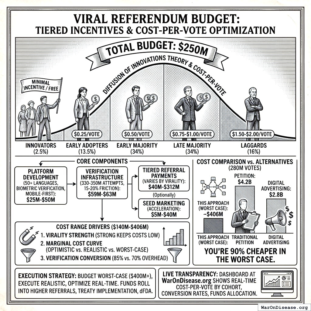 Your Execution Strategy: Budget for worst-case ($400M+). Execute with realistic assumptions. Optimize in real-time based on actual cost-per-vote data. Roll unused funds into higher referral payments, treaty implementation, or decentralized FDA146,147 development. Unlike your military, you don’t lose the savings in a couch cushion.