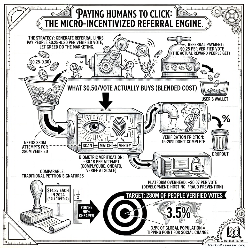 The strategy: Generate referral links, pay people $0.25-0.30 per verified vote, let greed do the marketing.