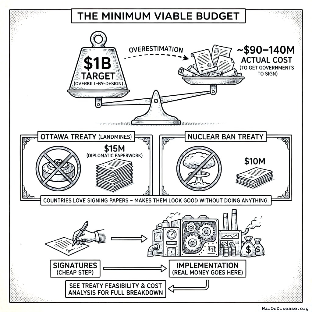 The $1B target is overkill-by-design. The actual cost to get governments to sign a piece of paper? Historically, ~$90-140 million.