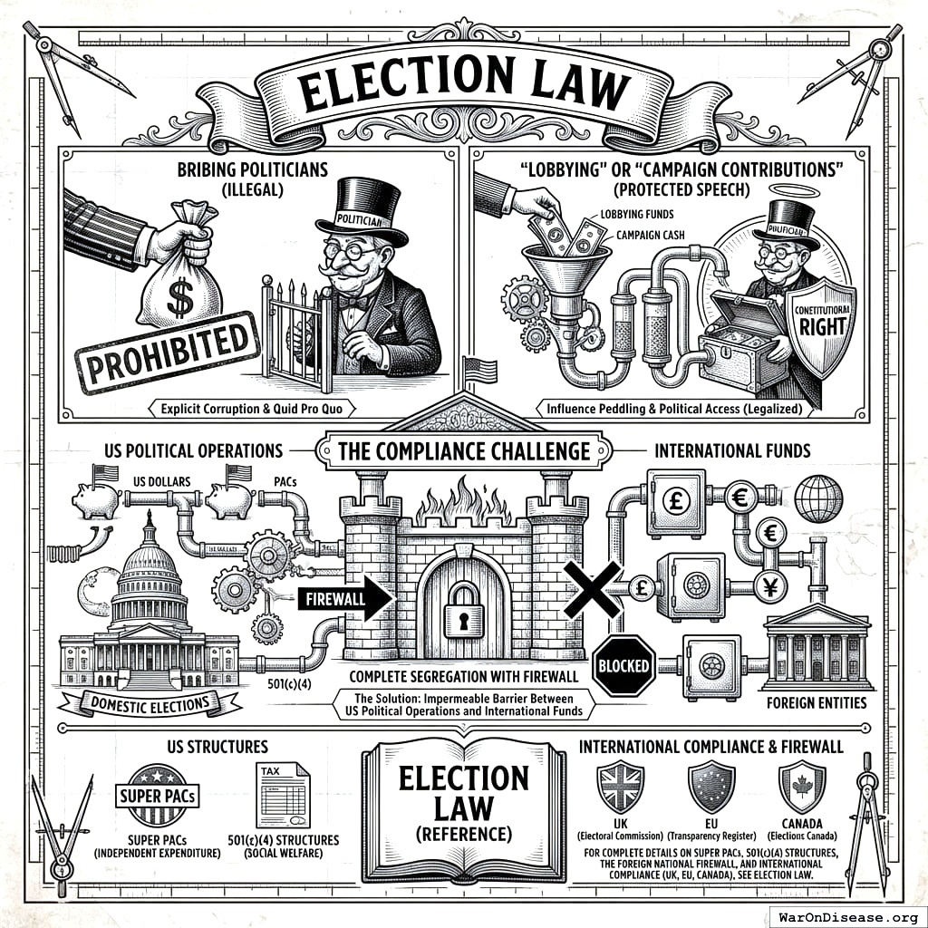 The firewalls matter more than the entities themselves. Charitable funds never touch political operations (the IRS is watching). Political funds never touch bond proceeds (the SEC is watching). International funds stay firewalled from US political spending (the FEC is watching). Separate bank accounts, separate staff, separate lawyers. Everyone watches everyone. This is called “compliance” and it’s the most expensive form of distrust your species has invented, which is saying something, because your species has invented a lot of expensive distrust.