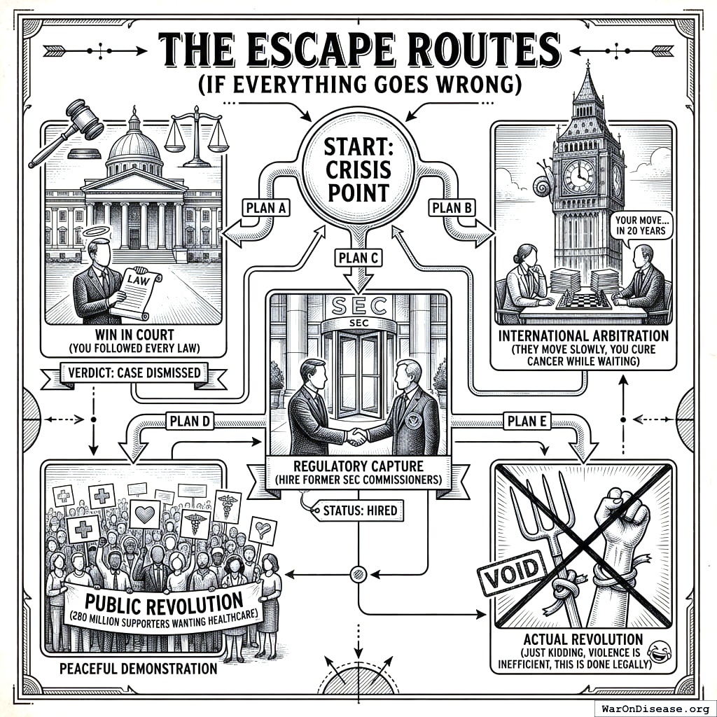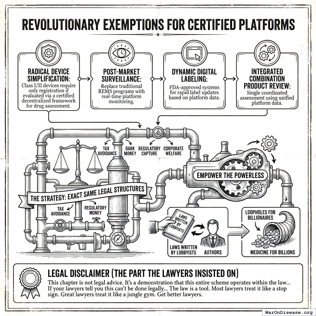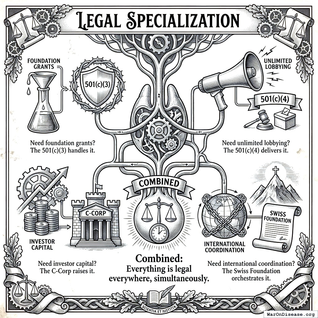 This entire strategy uses the exact same legal structures that currently enable tax avoidance, dark money, and corporate welfare. The tools of corruption, repurposed for medicine. The loopholes meant for billionaires will fund medicine for billions.