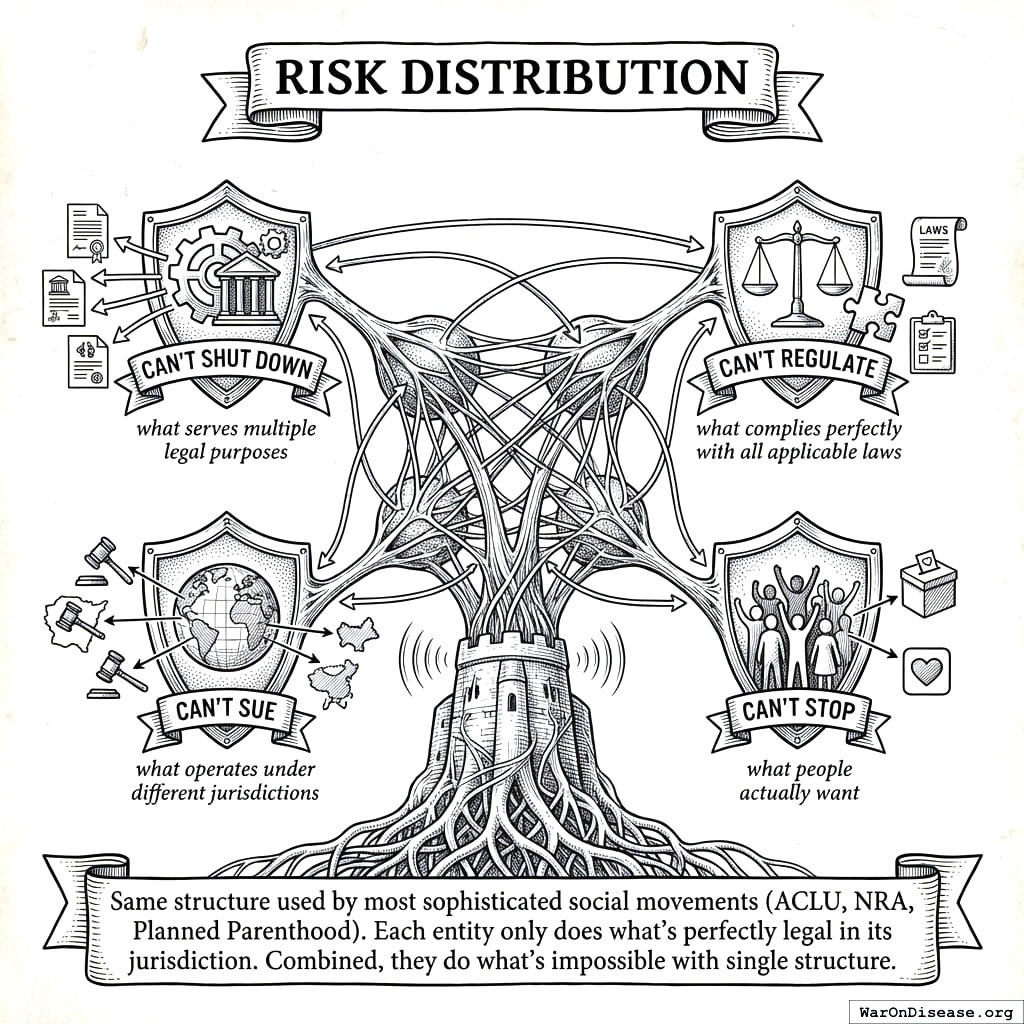 What kind of organization fits: A purpose-built 501(c)(4) social welfare organization paired with a for-profit Victory Corporation, modeled on the ACLU, NRA, or Planned Parenthood structure. These organizations have been running the same legal playbook for decades. The only difference is the target: diseases instead of guns, reproductive rights, or civil liberties.
