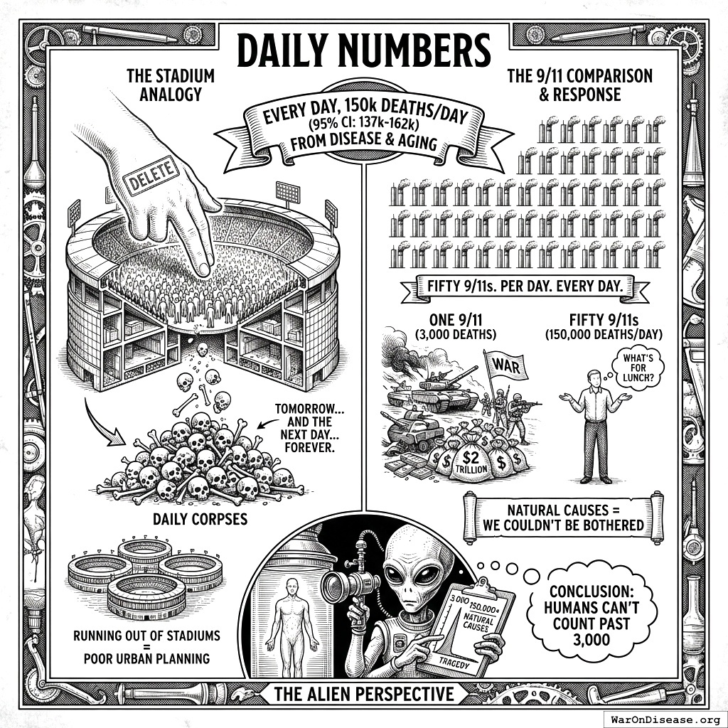 Every day, 150,000 humans die from disease and aging. That’s fifty 9/11s. Per day. Including weekends and holidays.