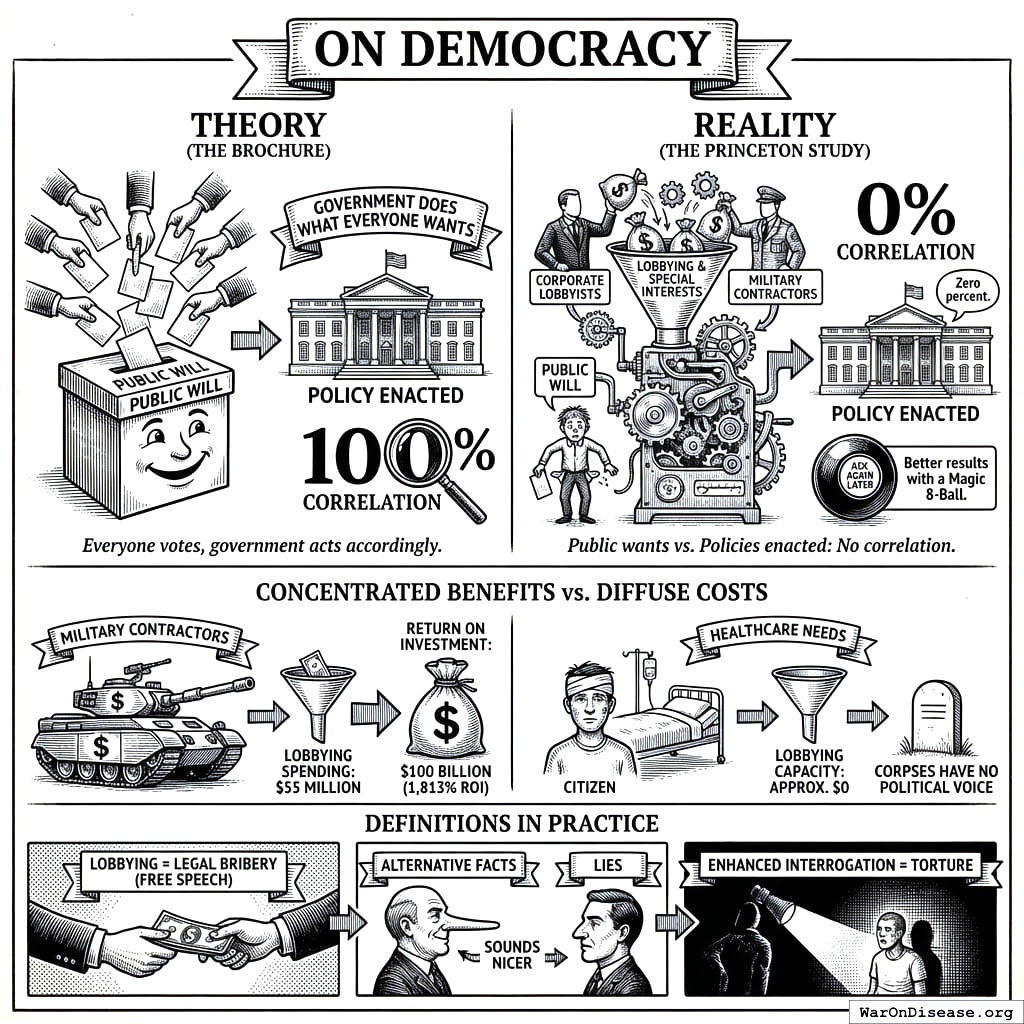 A Princeton study found 0% correlation between what the public wants and what policies get enacted. Zero. Not “low.” Not “disappointing.” Zero. Your democracy has the same correlation with your preferences as a coin flip has with your breakfast order.