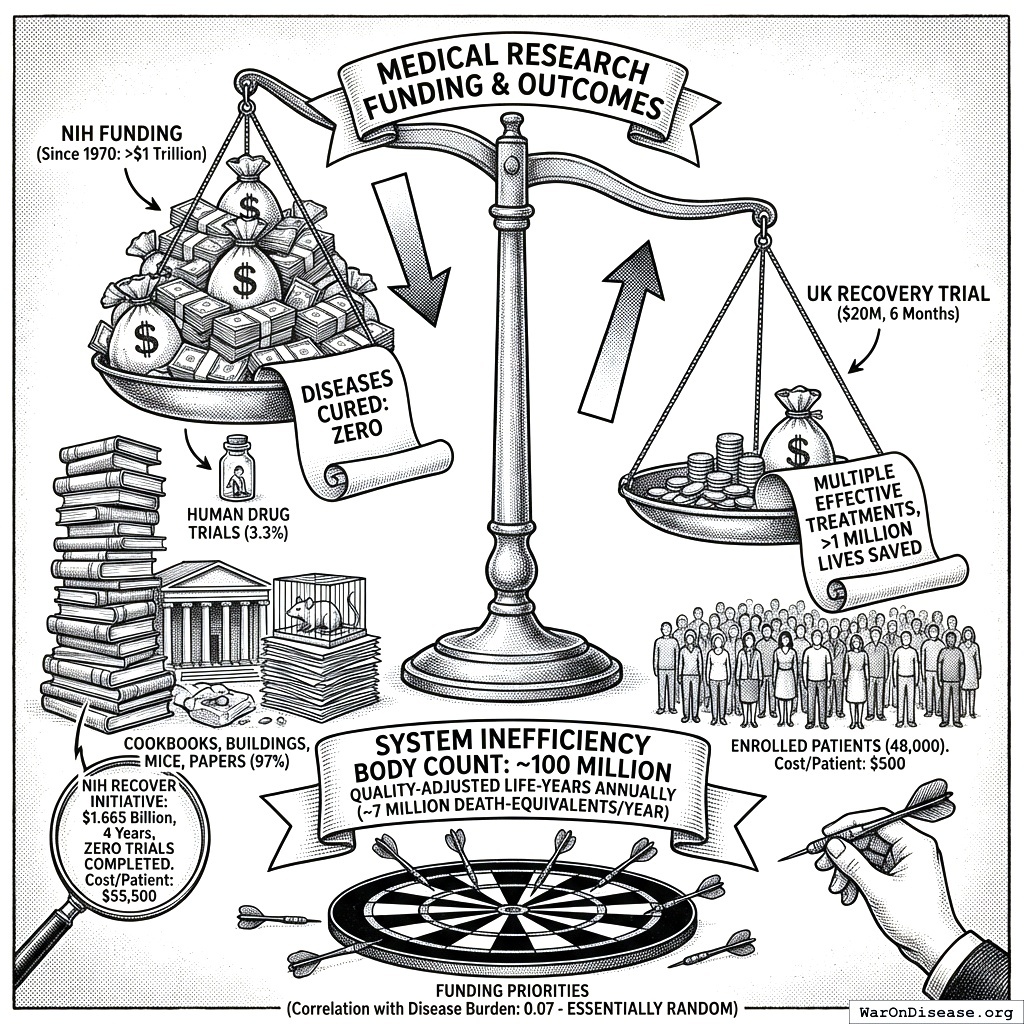 Of its $47B (95% CI: $45B-$50B) annual budget, only 3.3% (95% CI: 2%-5%) goes to actual drug trials in humans. The other 97% goes to studying mice, building buildings, and publishing papers nobody reads. The system operates at 2% of its potential capacity to save lives.