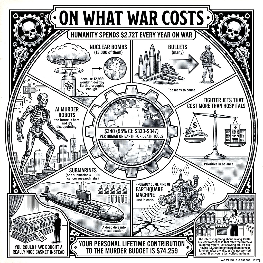 Humanity spends $2.72T every year on war. That works out to $340 (95% CI: $333-$347) per human on Earth for death tools.