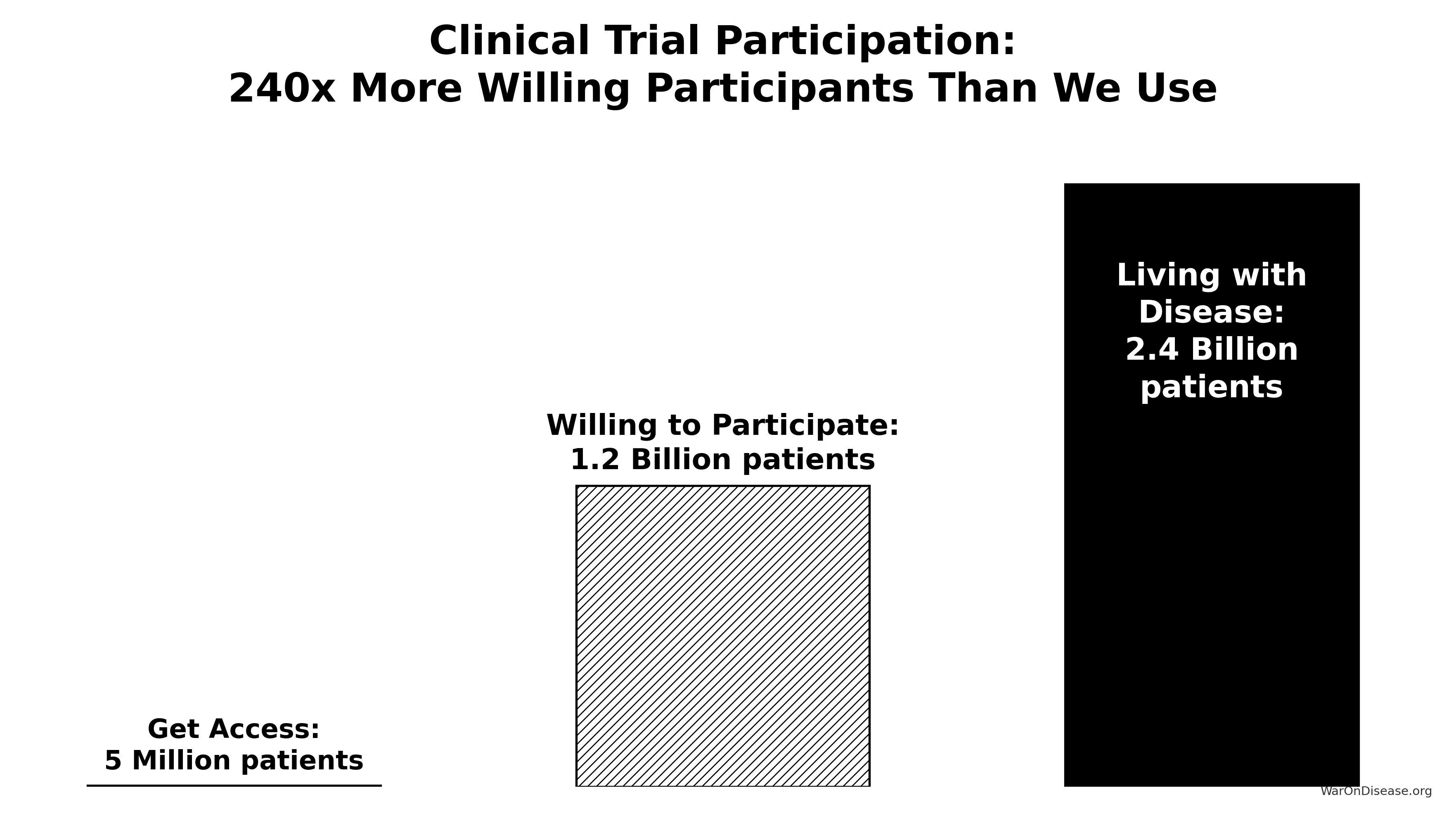 ACS CAN: Barriers to Clinical Trial Enrollment https://www.fightcancer.org/policy-resources/barriers-patient-enrollment-therapeutic-clinical-trials-cancer Only 3-5% of adult cancer patients in US receive treatment within clinical trials About 5% of American adults have ever participated in any clinical trial Oncology: 2-3% of all oncology patients participate Contrast: 50-60% enrollment for pediatric cancer trials (<15 years old) Note: 20% of cancer trials fail due to insufficient enrollment; 11% of research sites enroll zero patients Additional sources: https://www.fightcancer.org/policy-resources/barriers-patient-enrollment-therapeutic-clinical-trials-cancer | https://hints.cancer.gov/docs/Briefs/HINTS_Brief_48.pdf