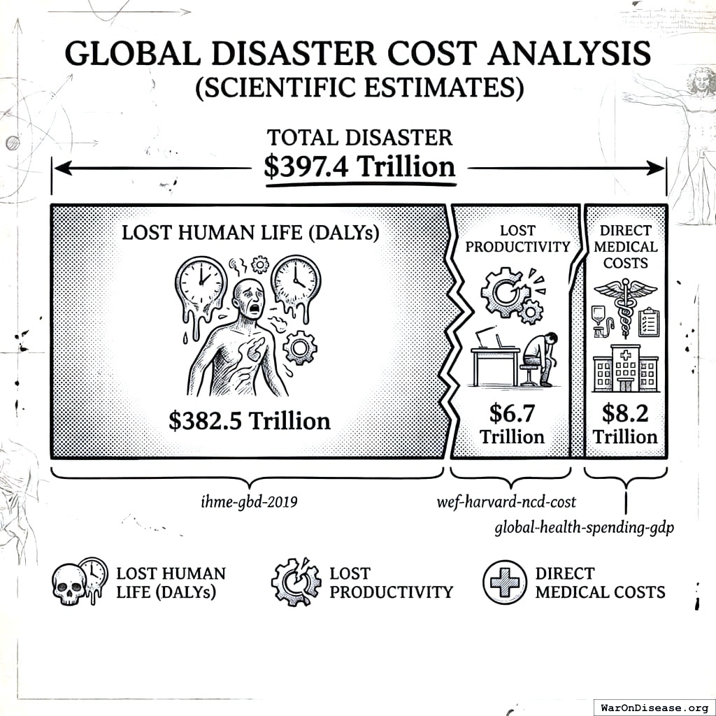 The entire human species combined? 2.55 BILLION DALYs annually146. That’s 2.55 billion years of human potential, dissolving annually into medical bills and funeral expenses.