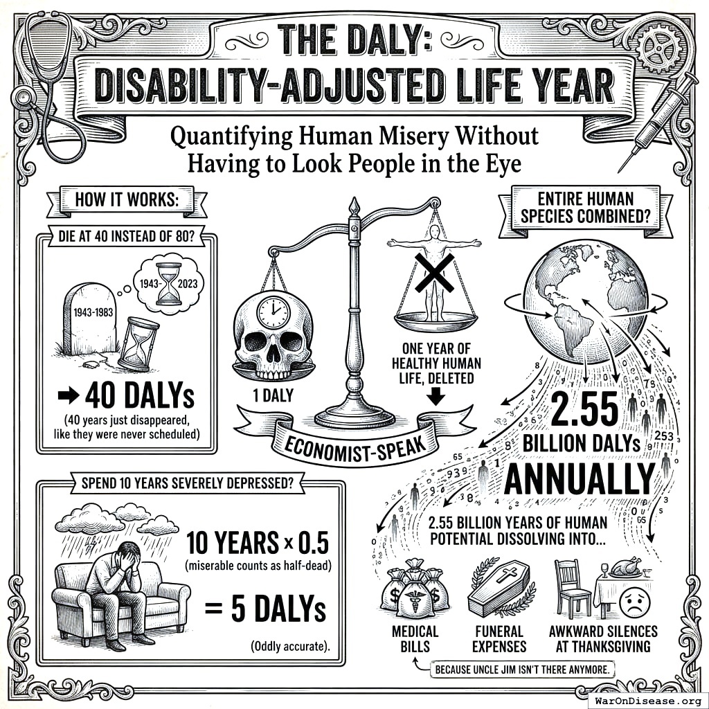 DALY stands for “Disability-Adjusted Life Year.” That’s economist-speak for “quantifying human misery without having to look people in the eye.”
