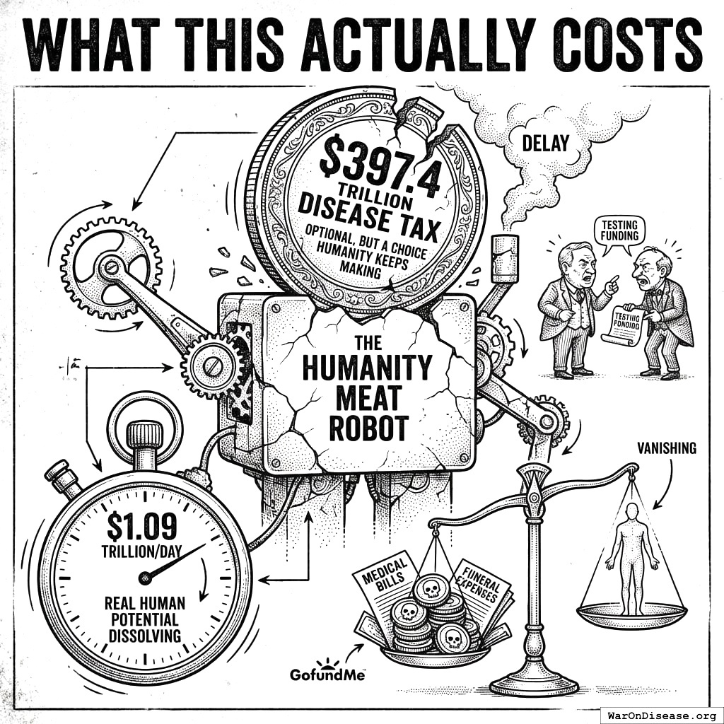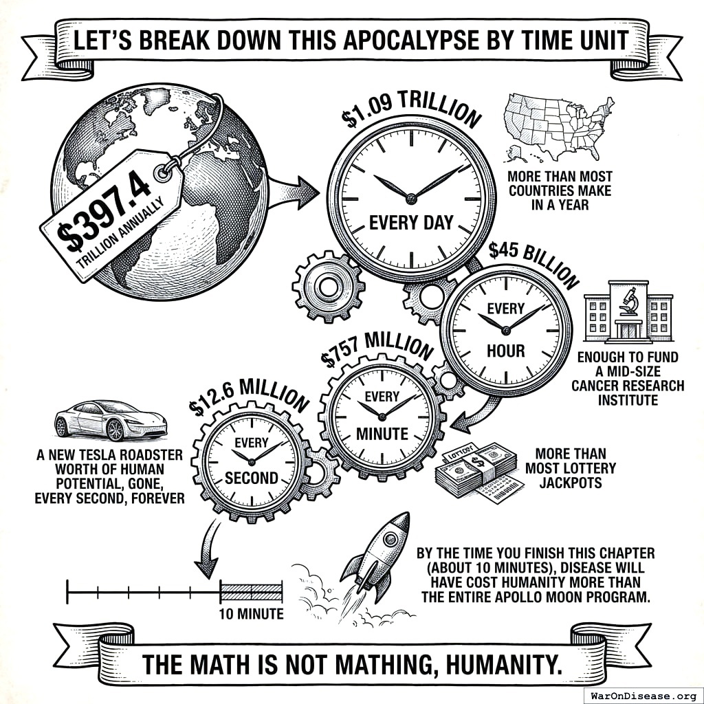 That’s more than the entire global economy. Every year. You lose more money to disease than you make doing everything else combined. It’s like running a lemonade stand that costs more in lemons than the entire GDP of Earth.