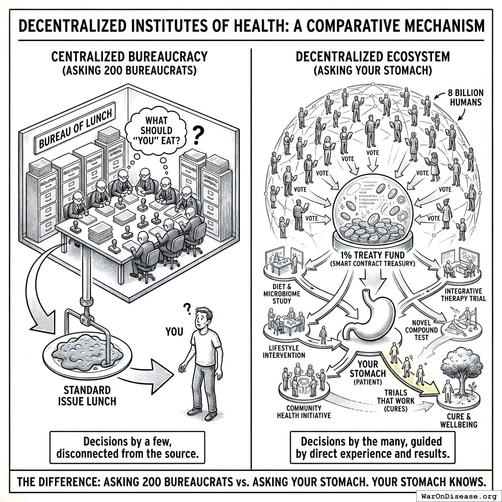 Researchers set their own price. Patients choose which trials to join. Money flows automatically. Markets decide, not committees. Sick people, guided by their doctors and data, choose what gets funded. Not bureaucrats. Not grant writers. Actual humans who need actual cures.
