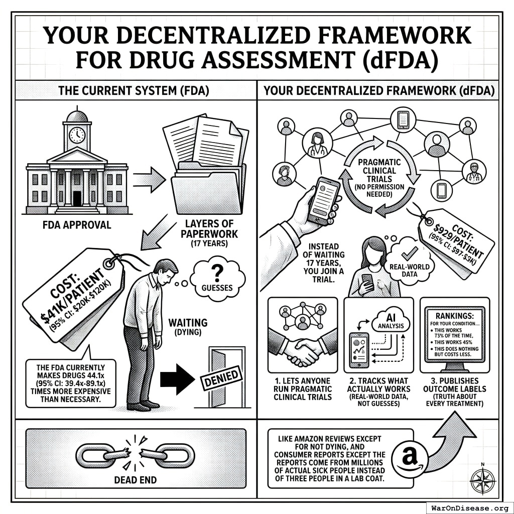 Instead of waiting 14 years (95% CI: 12 years-17 years) from discovery to patient while you die, you join a trial. It costs $929 (95% CI: $97-$3K) instead of $41K (95% CI: $20K-$120K). You report outcomes through your phone. The AI analyzes millions of data points. The framework publishes rankings: “For your condition, this works 73% of the time, this works 45%, this does nothing but costs less.”