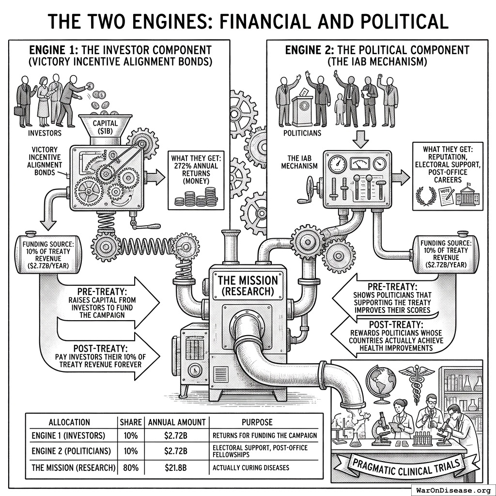 IABs break the loop. Investors give money and get money back (10% revenue share). That’s it. They don’t decide which diseases get funded. Politicians get career incentives (10%). They don’t touch the research budget. The remaining 80% flows to clinical trials via wishocratic allocation, controlled by direct democracy, not by the people who paid for it. Corruption capped at 20%, transparent, and completely separated from the medicine money. Name a government budget that can say the same.