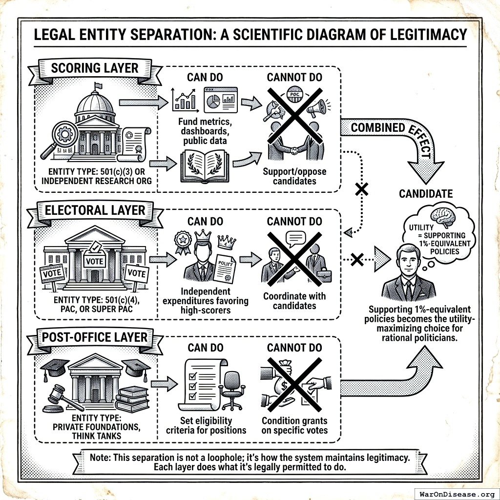 The structural difference from current lobbying: in the current system, money and influence are inseparable. Give money, get influence over where it goes, use that to get more money. The loop is opaque and self-reinforcing.
