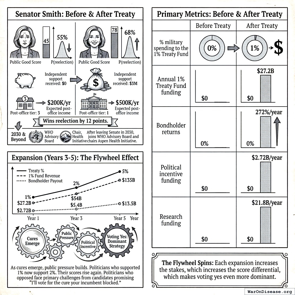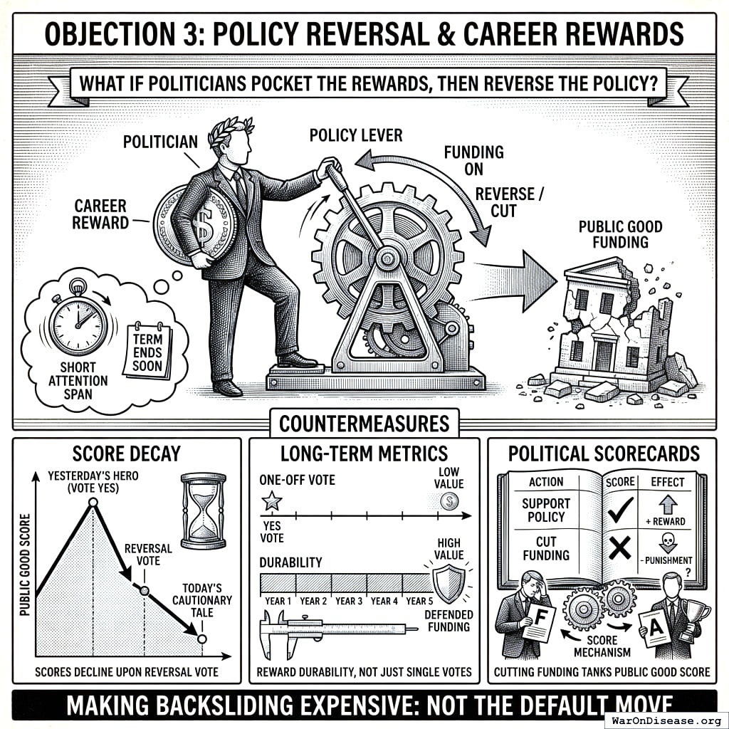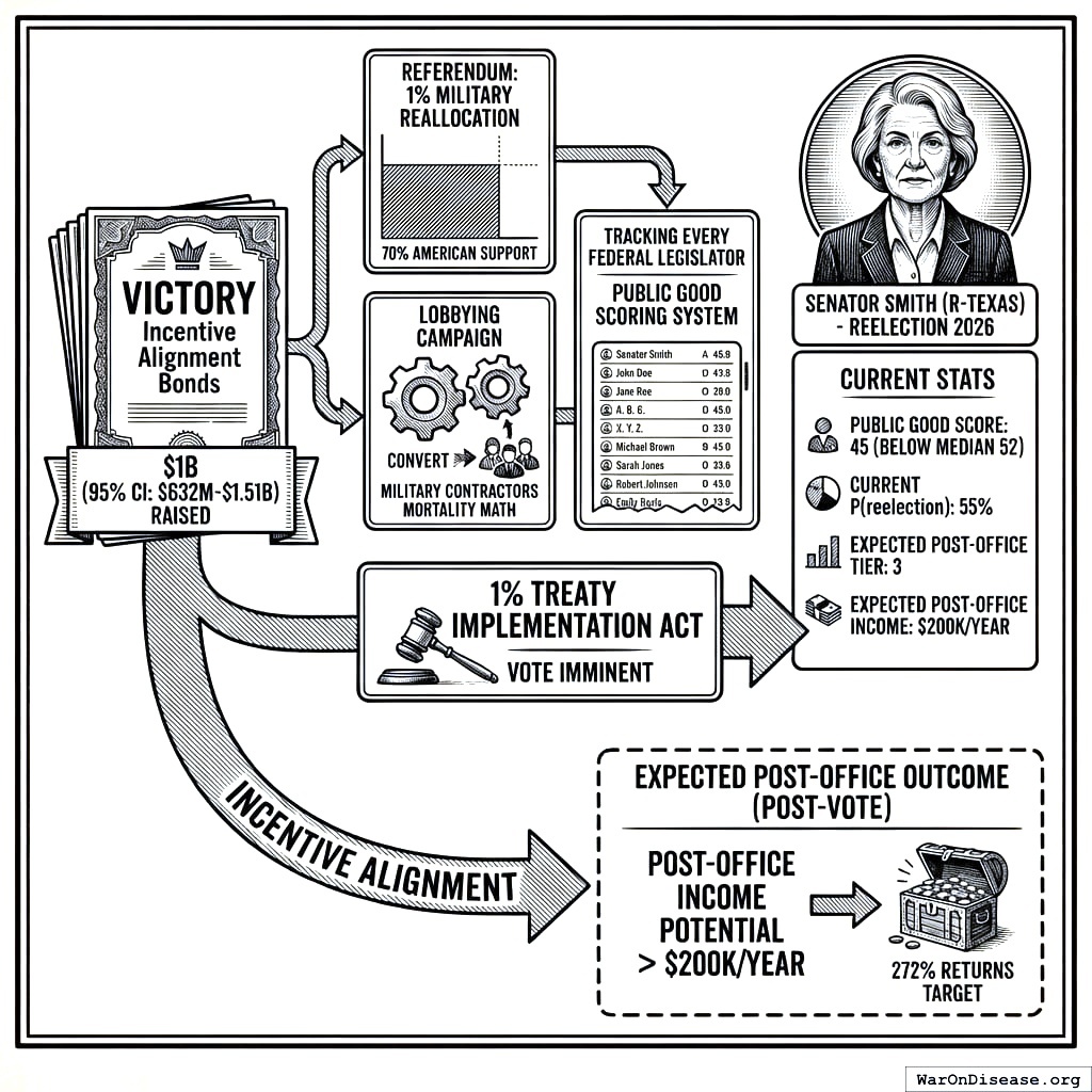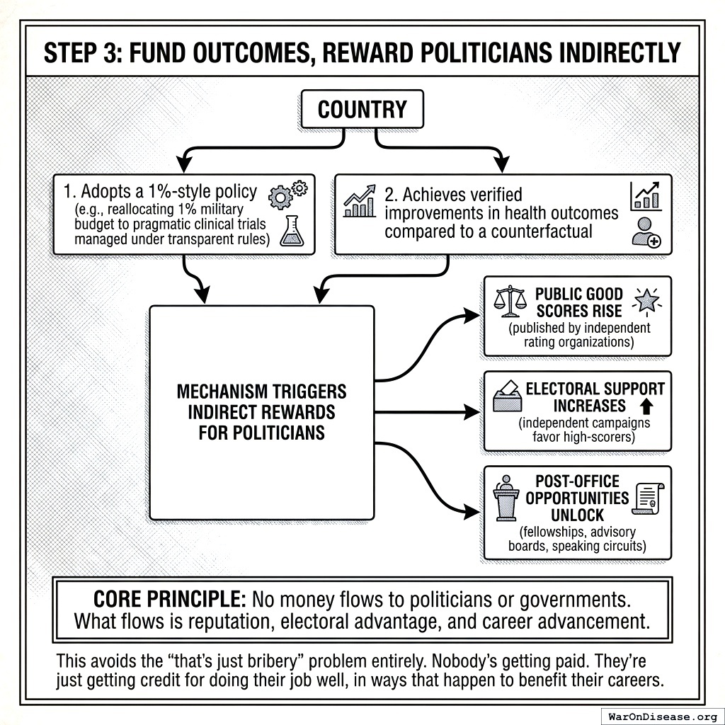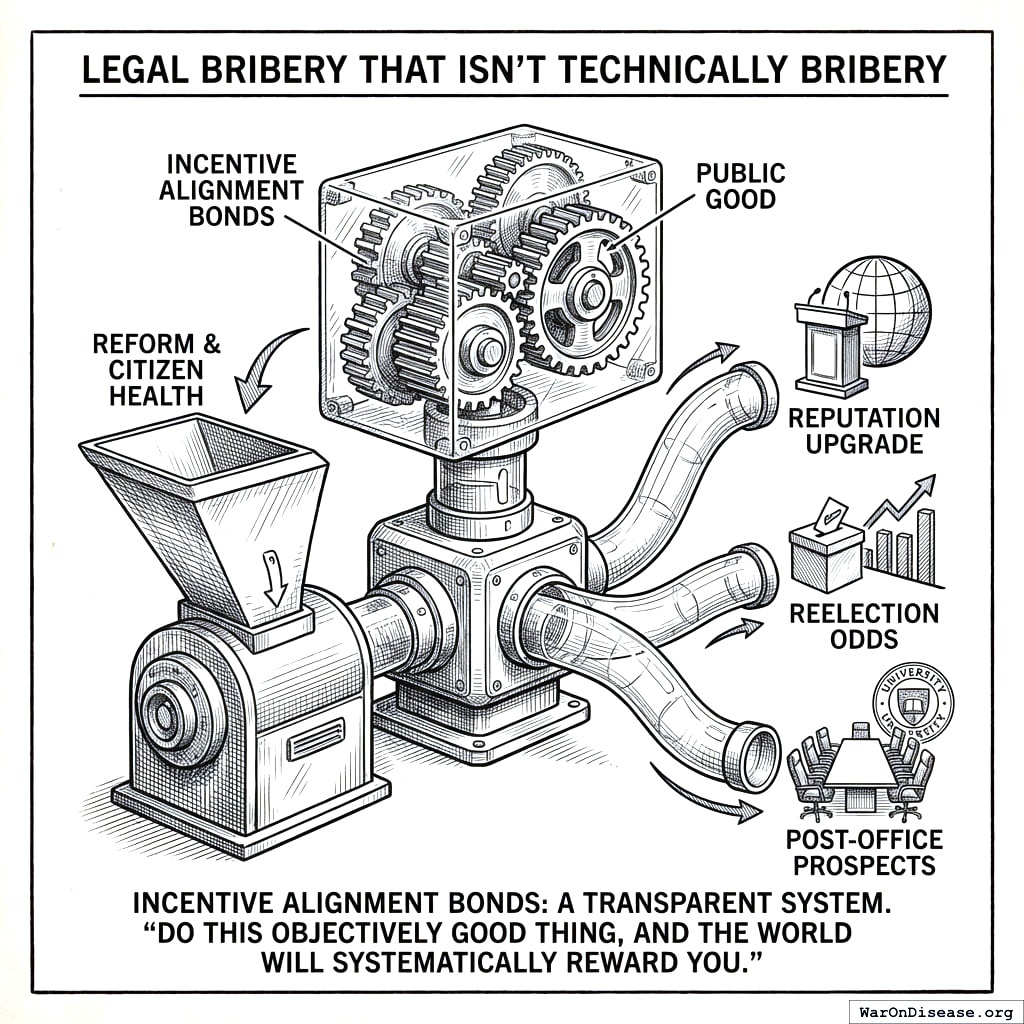 The fix: tell every politician on Earth, “Vote for a 1%-style reform and you get better reelection odds and a Goldman Sachs board seat when you retire.” No backroom deals. No suitcases of cash. Just a standing, public rule: do the right thing, get rewarded. Nobody has to become a better person. The money just circulates until diseases stop existing.