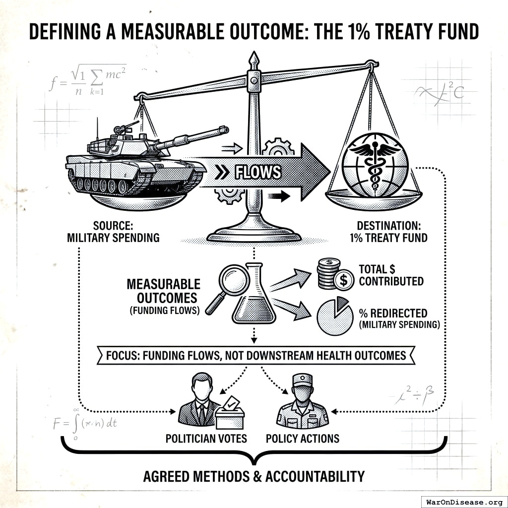 Measure funding flows, not health outcomes. You can’t attribute a treatment breakthrough to any single country’s funding. But you CAN measure: % of military spending redirected, total $ contributed, and politician votes on treaty passage. Health improvements justify the policy. Funding flows are the scoreboard (because that’s what politicians actually control).