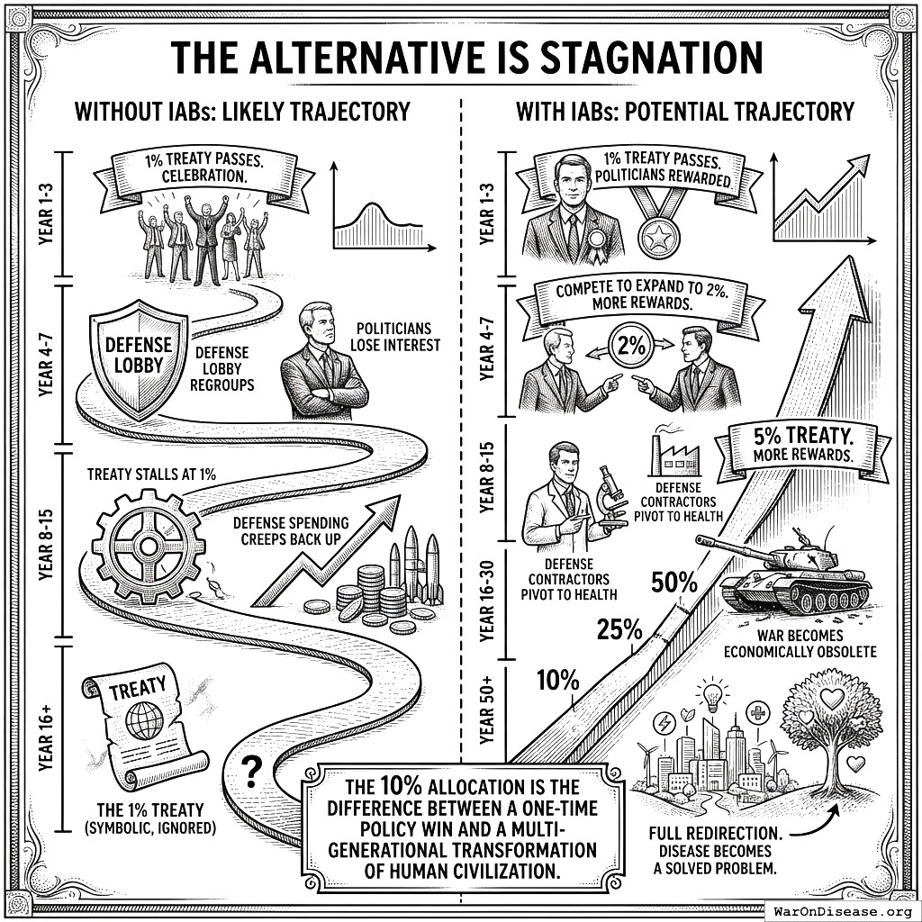 10.5281/zenodo.18161560 6.65 thousand diseases have zero FDA-approved treatments; at current trial capacity, exploring them takes 443 years. Redirecting 1% of military spending scales capacity 12.3x, cutting the timeline to 36 years and preventing 10.7 billion deaths. At $0.00177/DALY, 50.3kx more cost-effective than the best existing interventions. Incentive Alignment Bonds make adoption politically viable.
