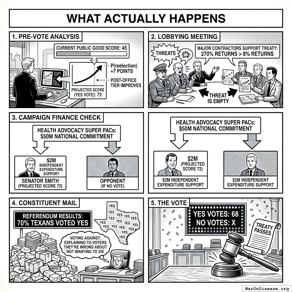 Foundations and think tanks set eligibility rules: score above X gets you WHO boards and Aspen fellowships. Below X, you’re explaining at dinner why you voted against curing diseases. The revolving door, but spinning toward “saved lives” instead of toward whoever paid the most lobbyists.