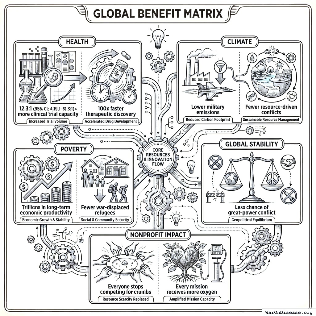 12.3x (95% CI: 4.2x-61.4x) more clinical trial capacity. Diseases get cured instead of managed (the pharmaceutical industry’s least favorite sentence). Militaries emit less pollution (nobody carbon-taxes a tank, but maybe they should). Fewer resource-driven conflicts means fewer refugees means less poverty. Everyone becomes slightly less dead, which is the lowest bar imaginable, and yet.